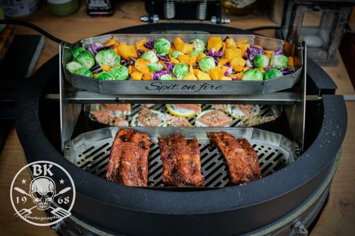 De Carrousel is gemaakt in een volledige RVS uitgevoerd en met zijn 3 manden een echte verrijking. Buikspek spareribs of gerookte zalm het kan allemaal. Mede door de roterende beweging die de manden krijgen binnen de gesloten barbecue. Hierdoor krijgt het eten een egale garing. Denk ook aan groenten, aardappel wedges, etc. Geschikt vanaf een medium maat, past op spits van The Spit on Fire, LetzQ en Joetisserie.
