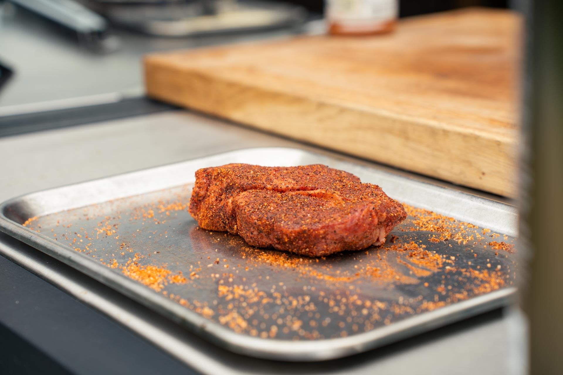 Maak de rib-eye schoon en wrijf hem royaal in met de Dirty Cow rub van Angus & Oink. Laat de rub ongeveer 15 minuten intrekken om de smaken goed in het vlees te laten trekken.
