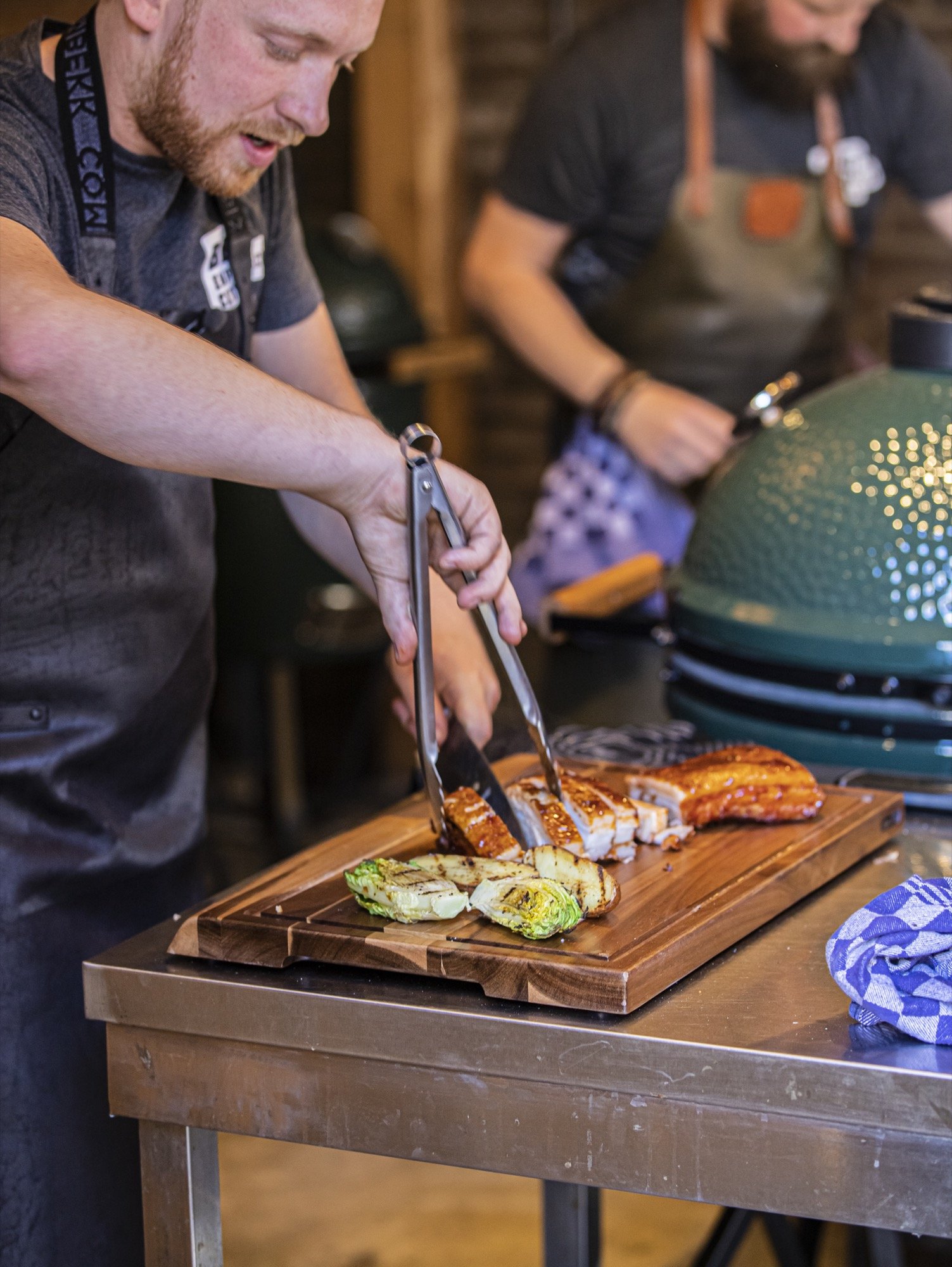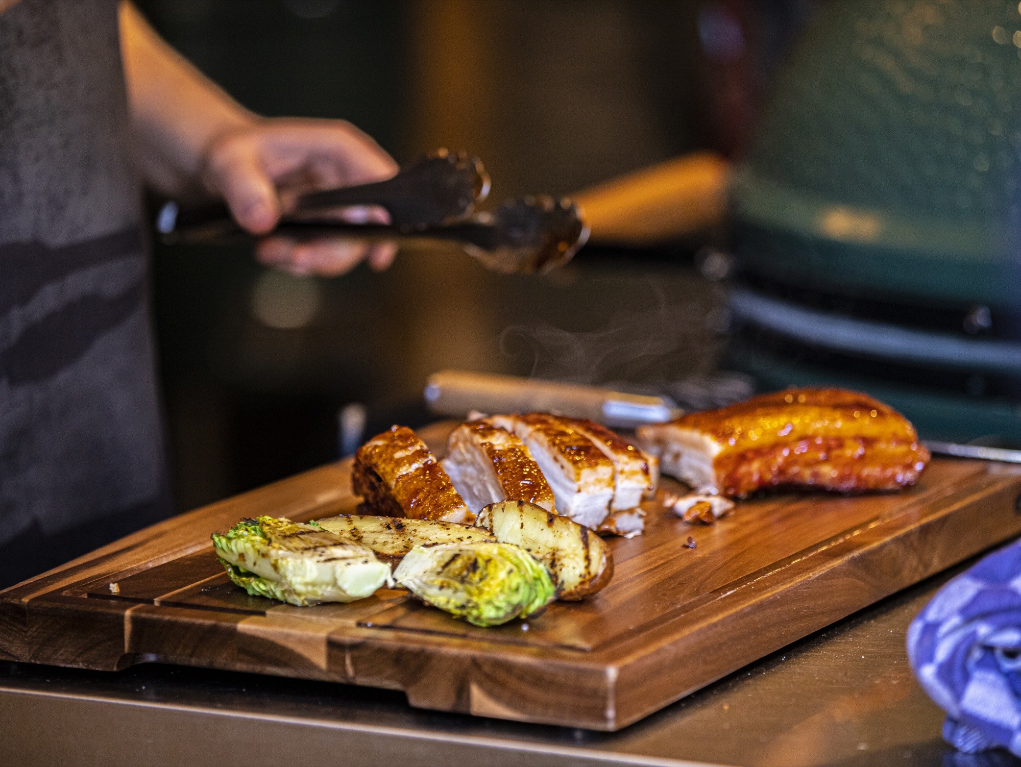 Snij vinger dikke plakken van het buikspek tegen de draad in en serveer aan je gasten met wat gegrilde garnituren. In de workshop komt het buikspek ook regelmatig terug en dan grillen we er een simpele little gem kropje bij op een gietijzeren rooster. Halveer het kropje in de lengte, kruiden met olie, peper en zout en even kort op een gietijzeren rooster grillen, 2 minuten maar. Vervolgens omdraaien en een drupje sojasaus erin laten vallen. Hierdoor krijg je meer smaak en stoomt het kropje gaar.