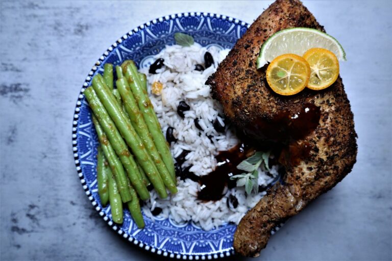 - Doe in een schaaltje de rijst met zwarte bonen, leg je kippenpoot op de rand en schik tegen de andere rand de pittige kokos boontjes. Garneer de kip, met een partje limoen en 2 schijfjes kumquat (mandarijn mag ook als dat makkelijker is) druppel en flinke lik, Saus.Guru blackpepper saus over de kip, ey comida sabrosa!