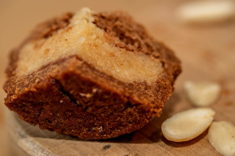 Tip: voor de foto heb ik de muffins bovenin open gelaten om de amandelspijs zichtbaar te houden. Maak de bovenkant echter dicht om te voorkomen dat de spijs te veel indroogt. Strijk de zes muffins nog lichtjes af met het los geklopt ei.