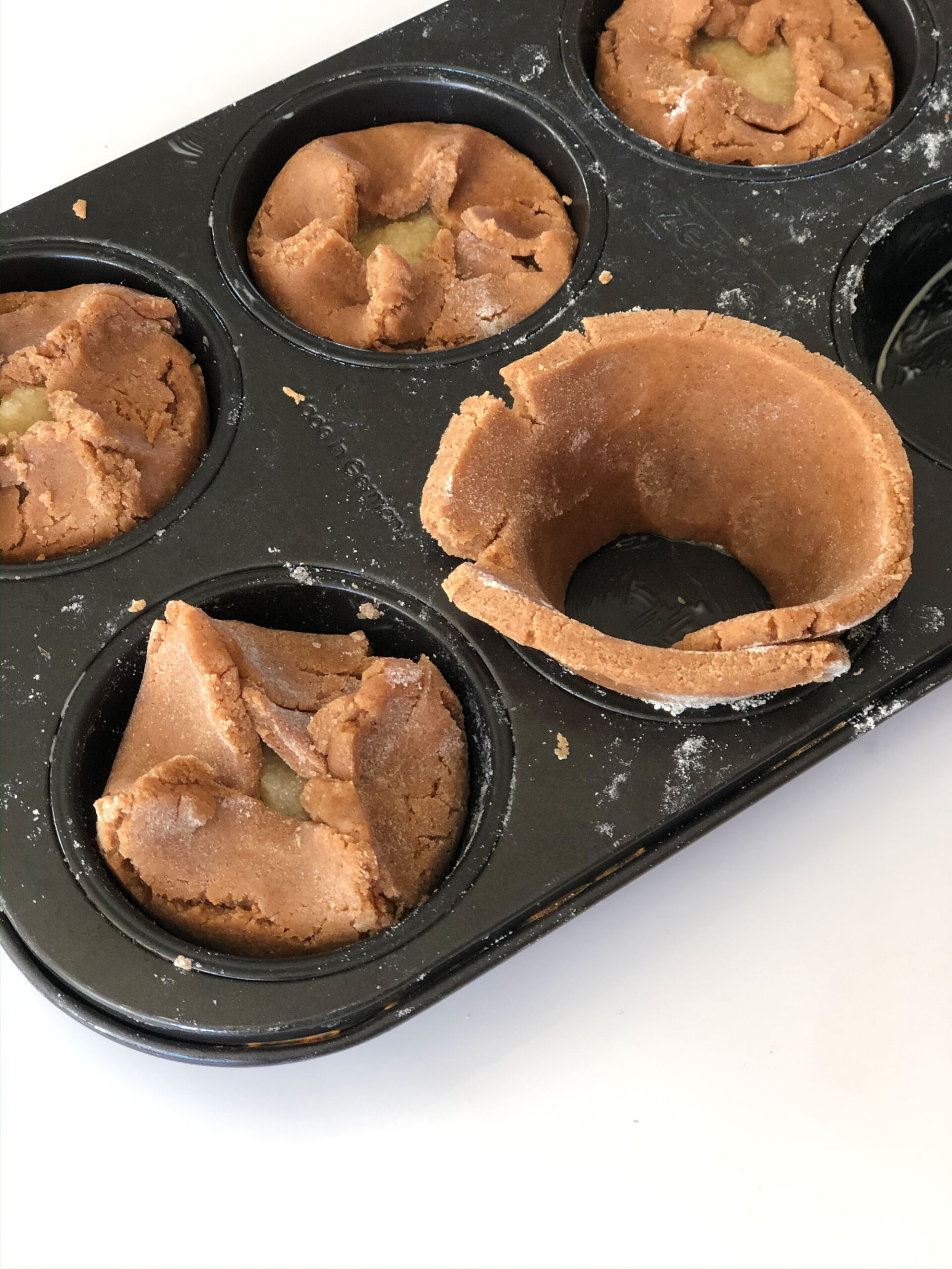 Vul iedere vorm tot de helft met amandelspijs. Het deeg wat rondom nog overeind staat kneden we naar binnen tot de muffin bovenin gesloten is.