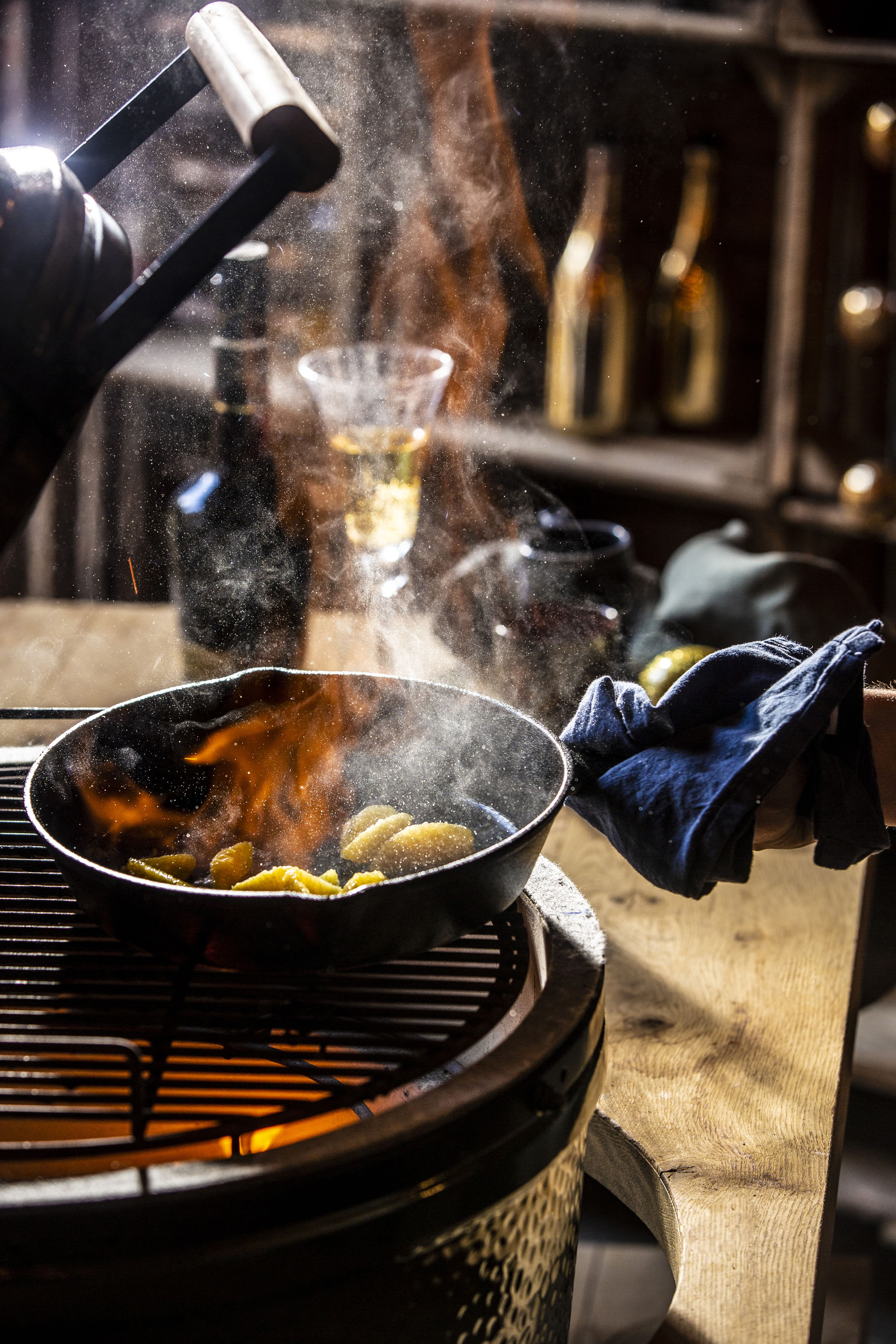 > Zet de skillet op het rooster en voeg voor de karamel de suiker en 2 eetlepels water toe. Sluit de deksel van de barbecue en laat de suiker karamelliseren; roer af en toe voorzichtig langs de rand van de skillet. Snijd intussen de roomboter in blokjes en het takje rozemarijn in stukjes.
