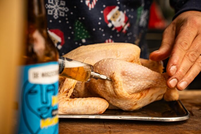Rasp eerst de schil van de sinaasappel (alleen het oranje deel) en pers hem uit. Pel de knoflook en hak hem fijn. De rozemarijn rits je: naaldjes van drie takjes fijnhakken, twee takjes blijven heel voor in de kip. Voor het rubben, meng je de sinaasappelrasp met de gehakte rozemarijn en knoflook. Vervolgens wrijf je de kip rondom in met dit mengsel en strooi er royaal chilli zout van Zeeuwsche Zoute over. Probeer ook wat onder het vel te krijgen bij de borst en poten, dan zit de smaak meteen op de juiste plek. Daarna gaan we de kip injecteren. Je vult de marinade-injector met de Dochter vd Burgemeester en verdeel het bier met een paar prikken over de borst en dijen. Niet overdrijven; kleine beetjes verspreid werken beter dan één grote shot. Voor het spekraster en opbinden leg je de plakken ontbijtspek kruislings tot een raster en drapeer dit over de borst. Bind het voorzichtig vast met opbindtouw, zodat het spek blijft liggen terwijl de kip draait. Stop de sinaasappel in kwarten samen met de overgebleven hele takjes rozemarijn in de buikholte. Bind de poten bij elkaar zodat de vulling blijft zitten en de kip mooi in balans hangt aan het spit.