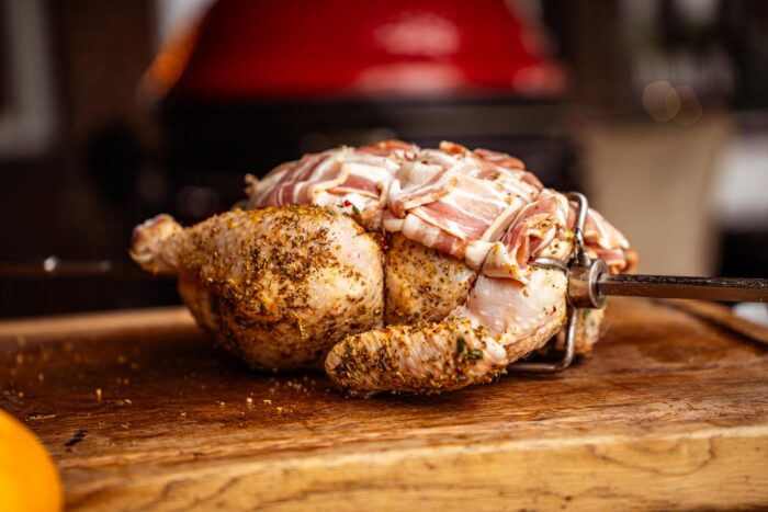 Deze kip is er eentje voor een volle tafel: geur van rozemarijn, sinaasappel en een hint rook van de BBQ. Met een spekraster over de borst blijft hij mooi beschermd en krijg je een knapperig jasje dat je zo wilt stelen van het bord.
