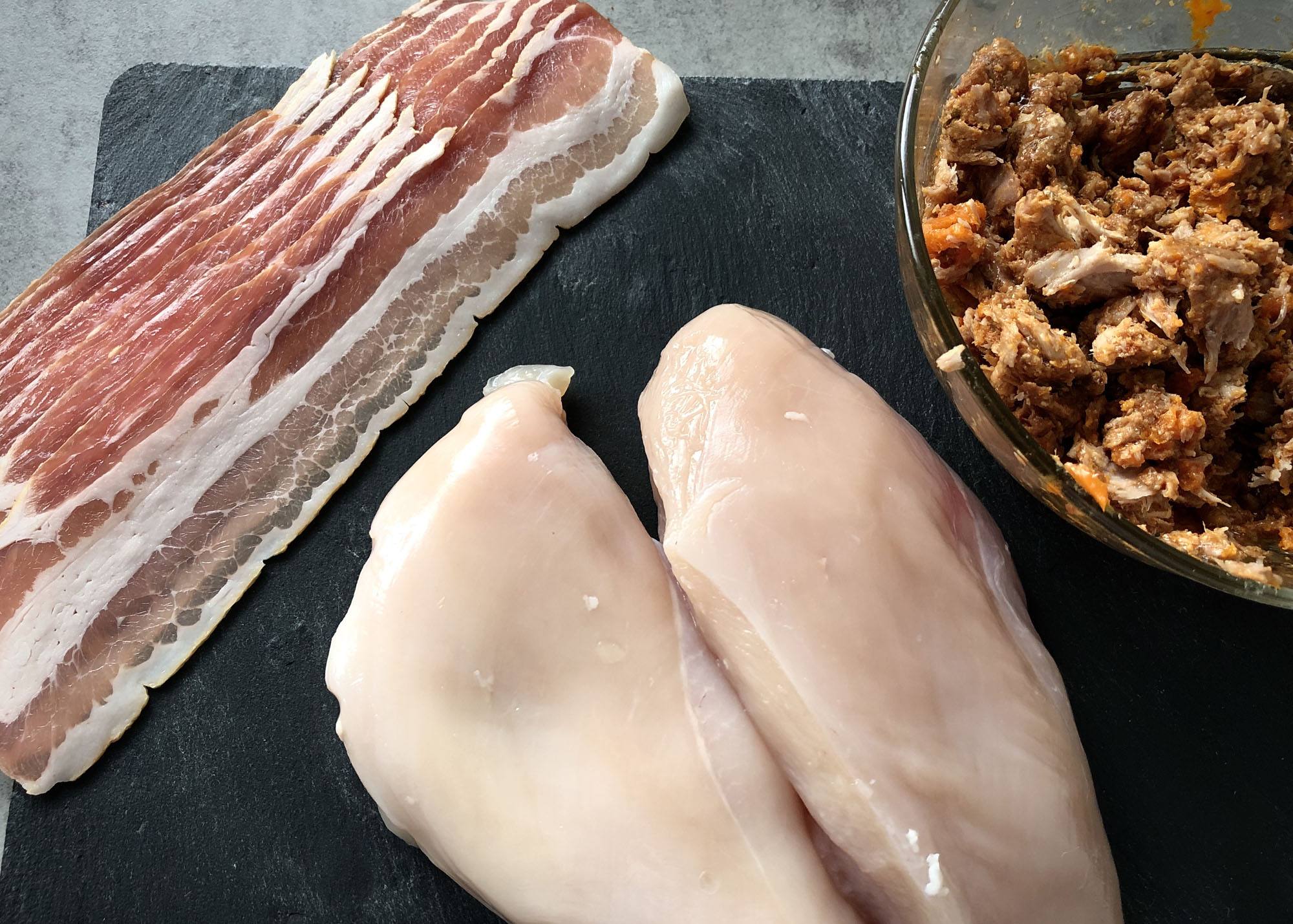 Snijd de kipfilets vanaf de lange zijde in maar snijd ze niet helemaal door. Klap de filets open en leg er per kipfilet ongeveer 80-100 gram pulled pork op. Rol de kipfilets op en bestrooi met de rub. Leg een stuk vershoudfolie op je werkblad en leg hier 4 plakken bacon per kipfilet op. Laat ze iets overlappen. Leg de kipfilets op de bacon en rol ze strak op in de bacon en folie. Laat ze even rusten.