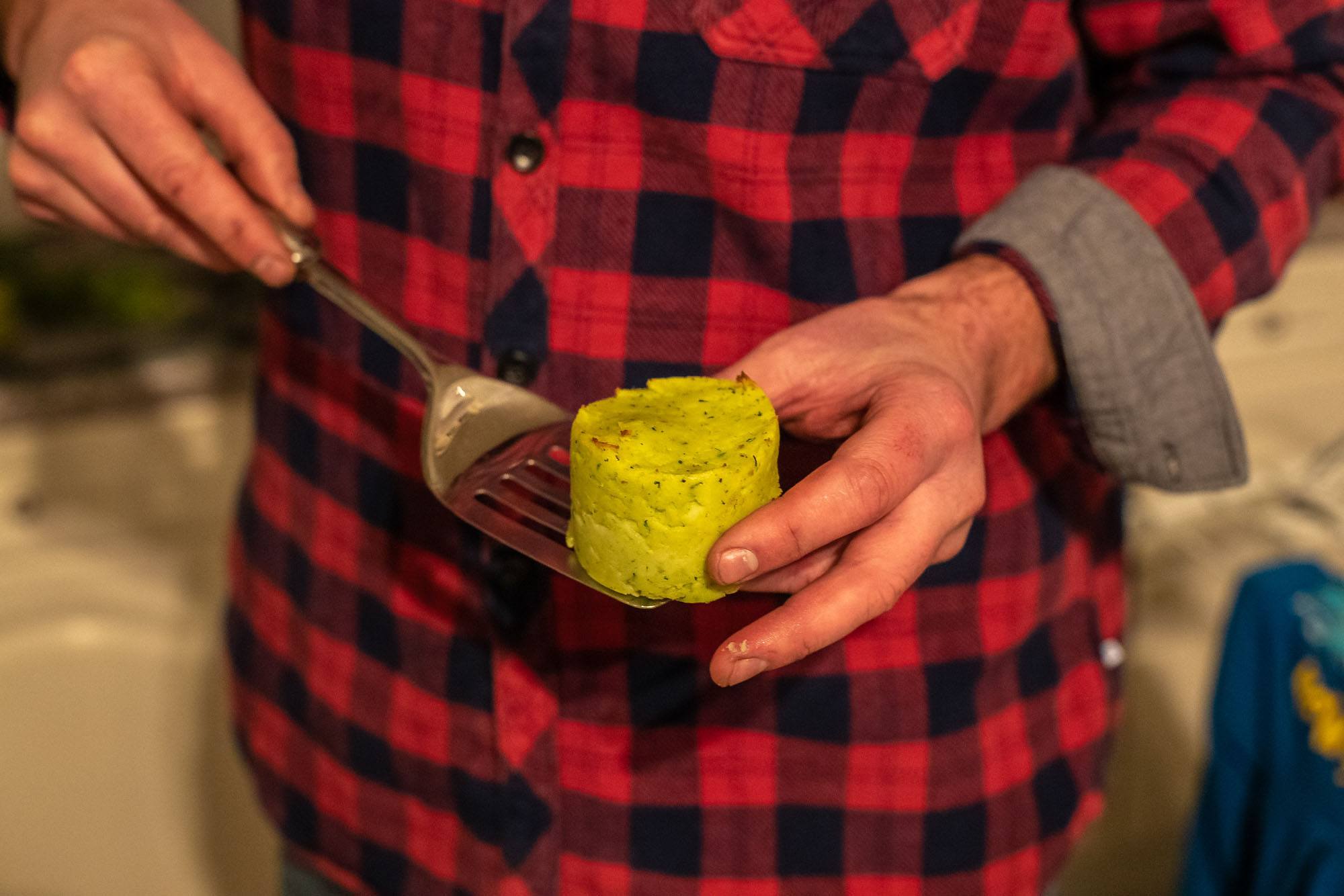 Voordat we de aardappelen op het vuur zetten gaan we de ingepakte ossenhaas op de gloeiend kolen leggen. De bereiding zal ongeveer 10 minuten in beslag nemen en daarna mag het nog zo’n 15 minuten rusten. Na 5 minuten keren we het pakket dus om en je zult voelen dat het zout al een harde laag om het vlees heeft gevormd. De doek is al aardig zwartgeblakerd, maar zit er nog stevig omheen. Na nog eens vijf minuten aan de andere zijde prikken we de thermapen kerntemperatuurmeter door het doek en de zoutkorst om te kijken of deze uitkomt op zo’n 38 graden Celsius.
