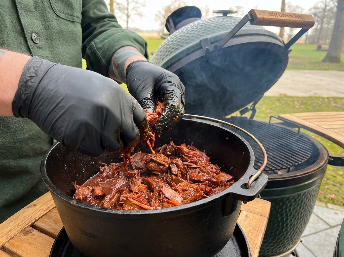 Na twee uur roken gaan de rundernekblokken in de Dutch Oven. Voeg de Saus.Guru BBQ Saus Mango Cinnamon, de runderbouillon en de gedroogde chilies toe. De saus en bouillon zorgen ervoor dat het vlees sappig blijft en de gedroogde chilies geven een subtiele, rokerige kick op de achtergrond. Zet de Dutch Oven zonder deksel terug op de barbecue op 140 °C en laat het geheel rustig sudderen voor 4 tot 5 uur totdat het vlees volledig uit elkaar valt. Je ziet de saus langzaam inkoken tot een glanzende laag.