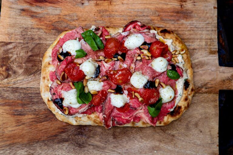 Bestrijk de focaccia met een mooi laagje spread. Beleg de spread met pastrami, en maak de pastrami op met de cherrytomaten, basilicum, pijnboompitten, mozzerella, balsamico creme, flink wat peper en zout en een dikke scheut olijfolie!