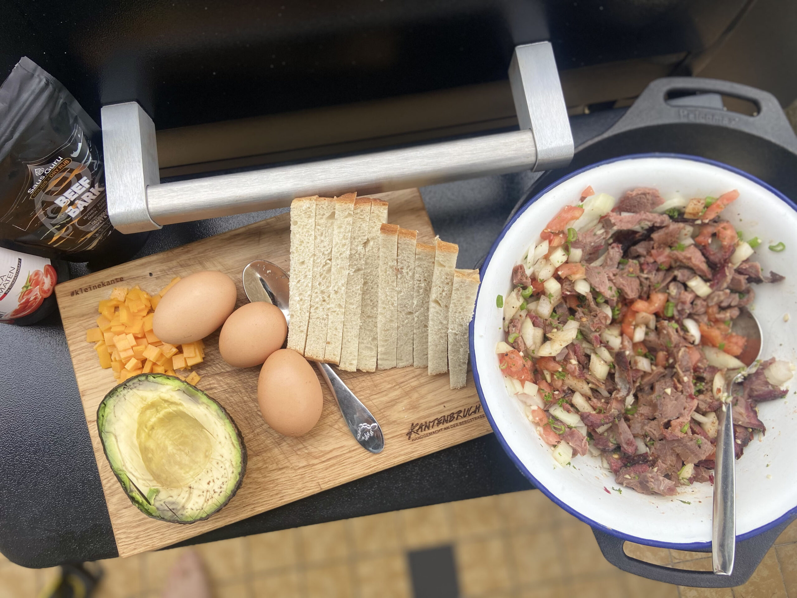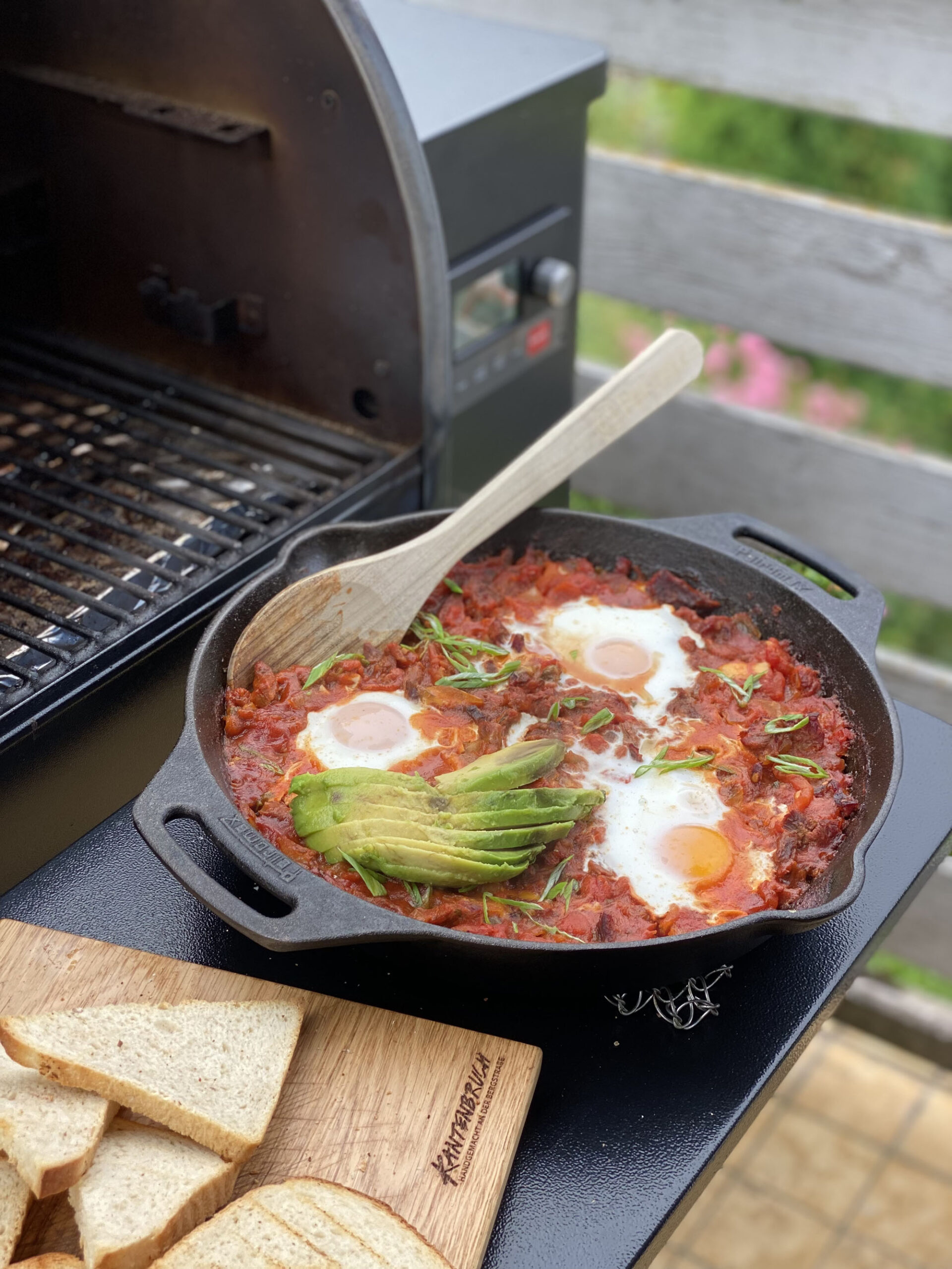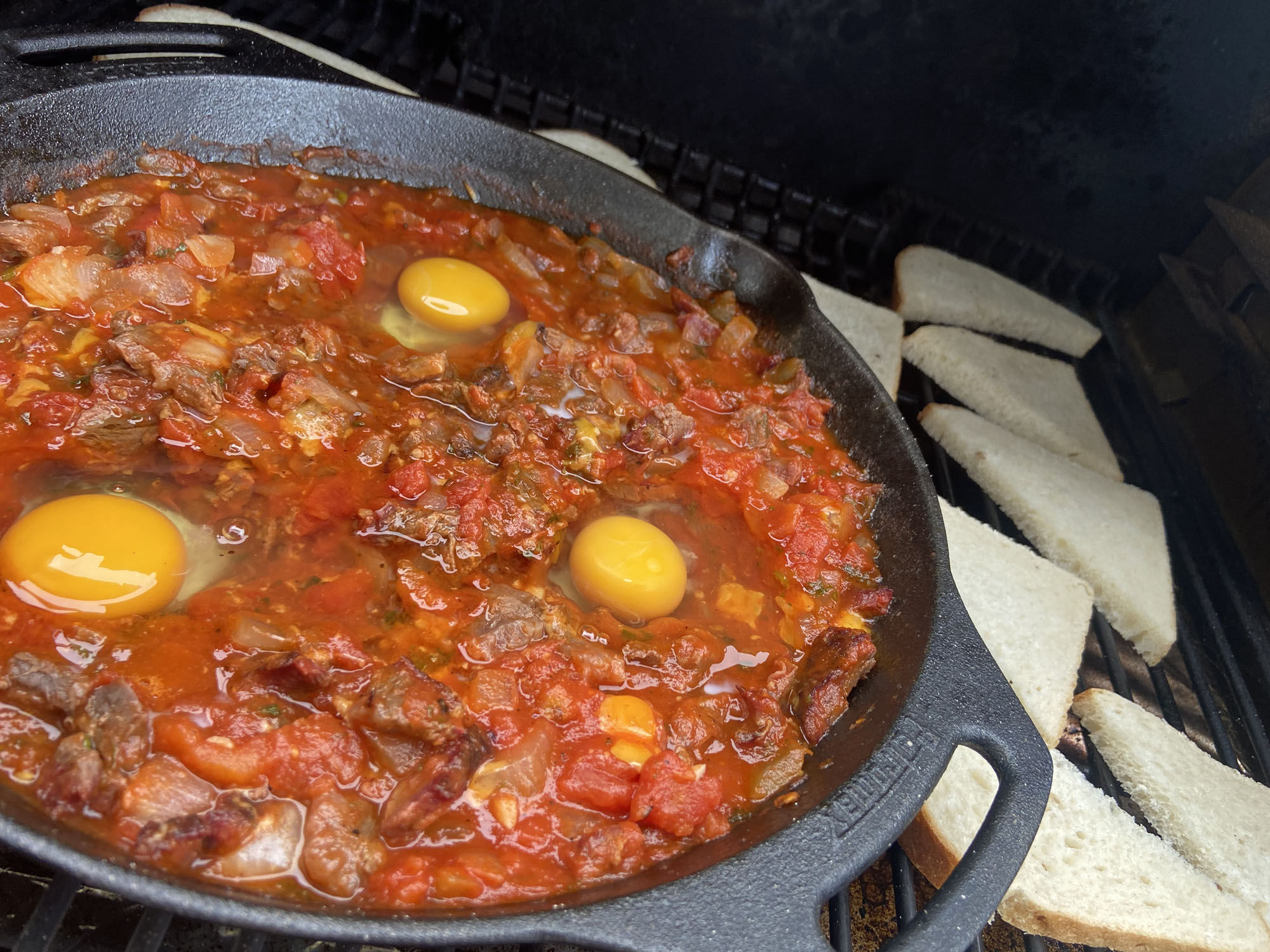Doe een klontje boter in de gietijzeren skillet en laat deze smelten. Voeg het mengsel uit de mengkom hier aan toe. Door alles tegelijk te verwarmen smoren we de ui niet en behoud deze een mooie bite. Wanneer het mengsel warm is (niet heet) roeren we de tomaten pulp er door. Wanneer alles opnieuw warm is maken we 3 kuiltjes en breken in iedere 1 ei. Bestrijk het brood met olijfolie door middel van het kwastje en leg dit op de barbecue. Wacht nu 4-5 minuten totdat de eitjes de gewenste garing hebben van binnen. Dit kan hard of zacht gepocheerd zijn. Serveer het gerecht warm met brood.