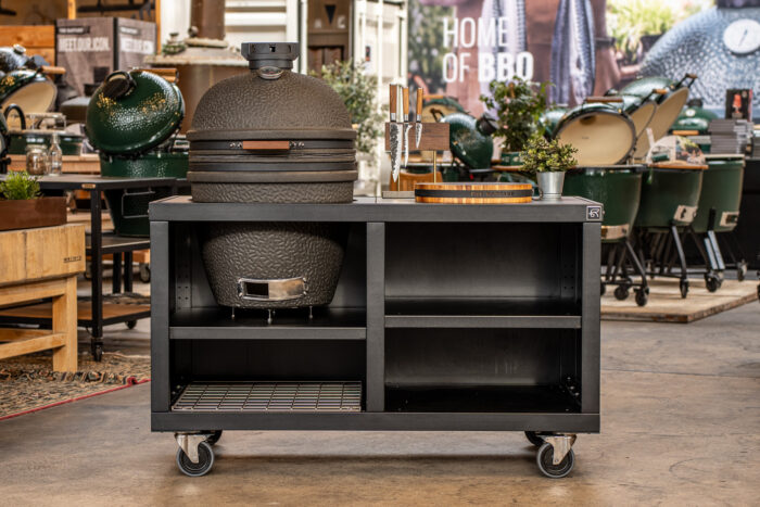 De buitenkeuken bevat verschillende kamado inlays, een kamado inlay aan de linkerkant, RVS-rooster bescherming en een Dekton Sirius werkblad aan de rechterkant van de kamado.