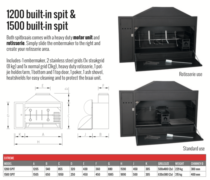 Deze braai is iets dieper dan reguliere modellen zodat er ruimte is voor grote stukken gebraad aan het spit. Hierdoor heb je alle ruimte om alle grillopties optimaal te benutten. Dit model heeft drie hitteschilden aan de achterkant en links achter het deurtje vind je een sterke, maar stille elektromotor. Hierdoor is de totale breedte van deze spitbraai 180 cm. Deze motor kan het spit van 120 cm draaien. De geïsoleerde kolenmaker is eenvoudig te verplaatsen waar- door je alle ruimte hebt voor een groot spit of een rotisserie set.